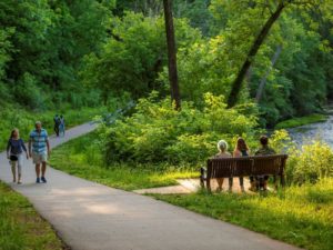 Riverwalk is a paved, accessible, urban greenway that stretches about 1.8 miles along the Eno River between Gold Park in West Hillsborough and trails east of town. It is a popular trail for walking, jogging, and cycling, and provides pedestrian connections between several neighborhoods. The trail is easy, mostly flat, and hosts beautiful views from the banks of the Eno River. The greenway’s downtown portion is the primary route of N.C. Mountains-to-Sea Trail, and the first section of the statewide trail system to be constructed in Orange County. Riverwalk also is one of the few sections of the Mountains-to-Sea Trail located in an urban environment, giving users easy access to restrooms, restaurants and shopping.