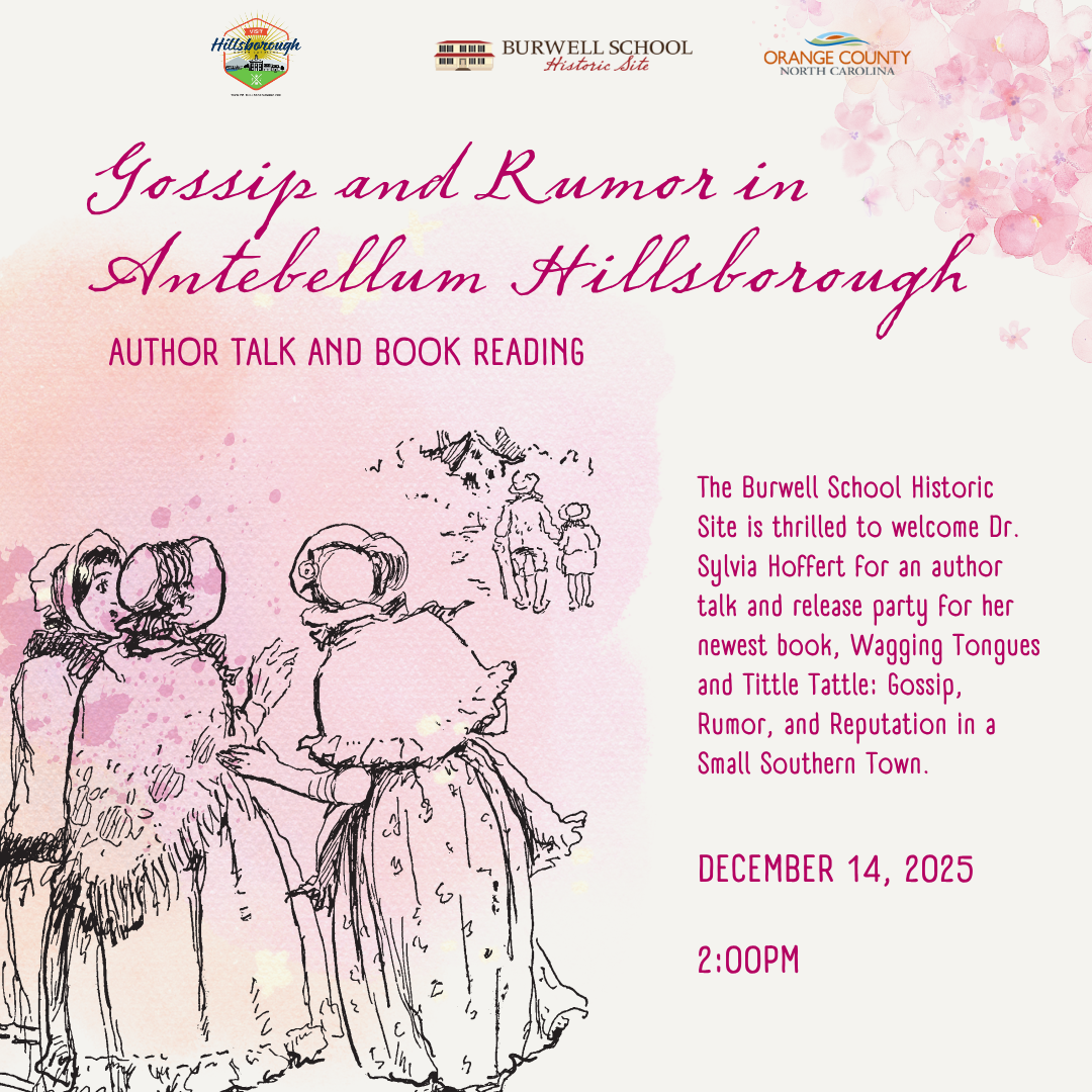 Before headlines and hashtags, news traveled by word of mouth, and in antebellum Hillsborough, gossip could change lives. Join historian Dr. Sylvia Hoffert for a captivating talk and reading from her new book, “Wagging Tongues and Tittle Tattle: Gossip, Rumor, and Reputation in a Small Southern Town.”