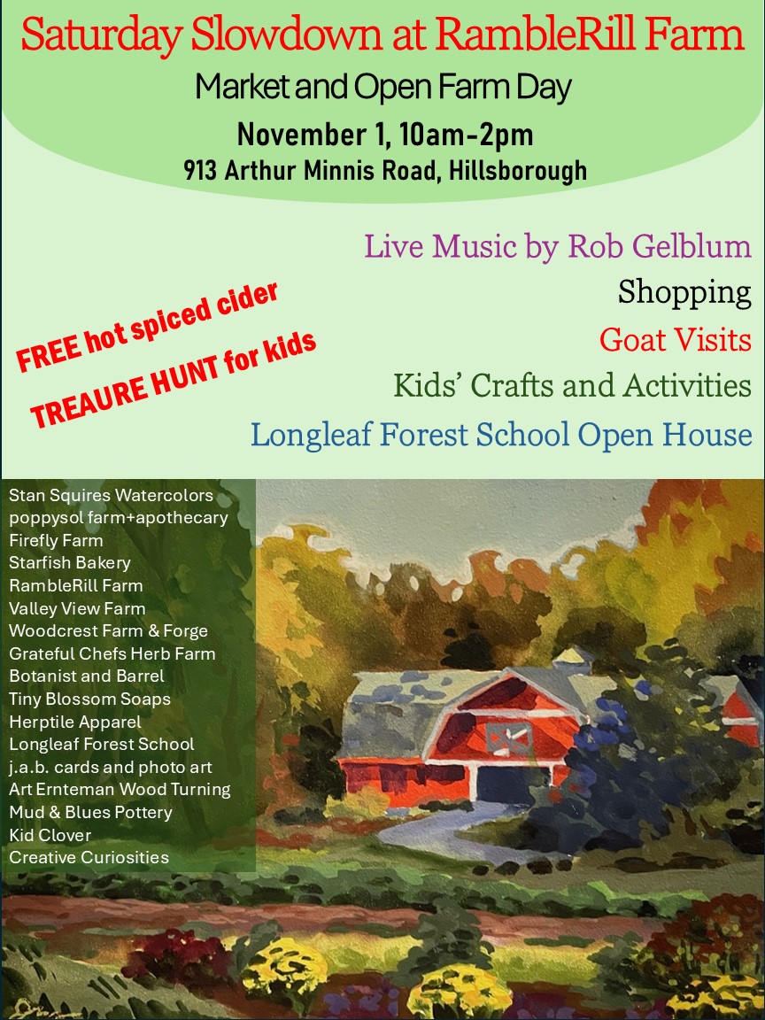 Celebrate fall with us this Saturday! Shop local makers, bakers, and growers; enjoy live music; visit the goats; bring a picnic; walk in the woods. Kids and families: don’t miss the Treasure Hunt and the Longleaf Forest School Open House and Play Date. Slowdown with us! 10am-2pm, Saturday, 11.1.25, 913 Arthur Minnis Road, Hillsborough, NC. Free admission.