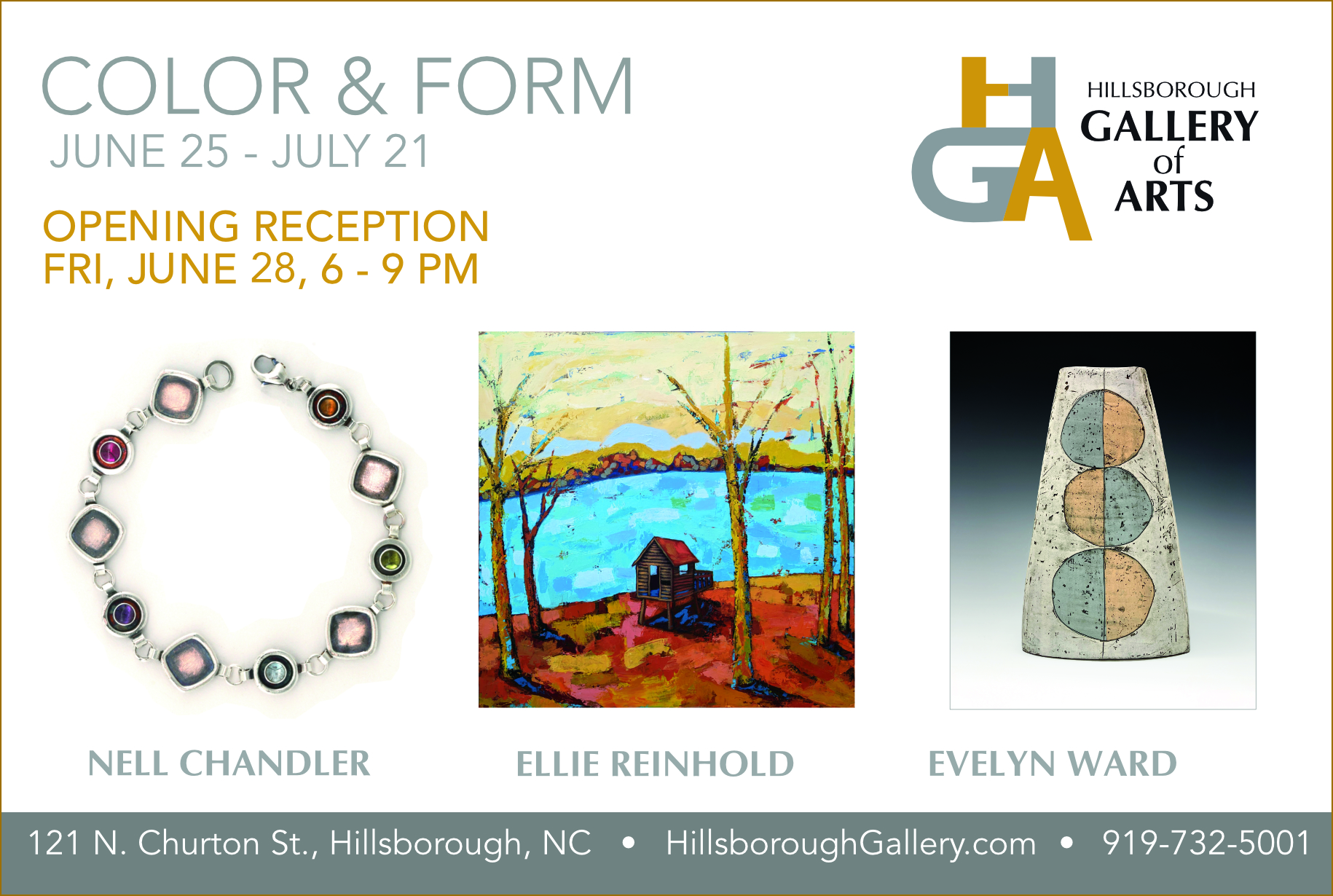 Mixed metal jewelry by Nell Chandler, abstracted landscape paintings by Ellie Reinhold, hand-made functional pottery by Evelyn Ward. In the gallery June 25th through July 21st. Opening reception during Hillsborough’s Last Friday Art Walk, June 28th, 6-9pm. The Hillsborough Gallery of Arts is owned by 21 local artists featuring painting, sculpture, photography, digital art, photomontage, glass arts, jewelry, handcrafted furniture, pottery, and mixed media. 121 N. Churton Street, Hillsborough NC. Hours: Monday through Saturday 10-6, Sunday 12 – 4. For more information about the show visit www.HillsboroughGallery.com