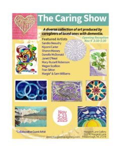 Join fellow artists for a collaborative open studio session. Work with others in a creative environment, get feedback on your work, and enjoy inspiration and creative process sharing with other artists. All mediums welcomed–bring your own tools and supplies. $5 per session, drop-ins welcome Ages 18+. Tickets can be purchased here: https://events.humanitix.com/drop-in-open-studio-at-eno-arts-mill A diverse collection of art produced by caregivers of loved ones with dementia. Opening reception is Sunday, November 9, 3:30-5:30 pm. Hosted at Margaret Lane Gallery. |