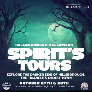 Explore the darker side of Hillsborough, the Triangle’s oldest town! Join the Alliance for Historic Hillsborough and The Orange Community Players for our annual Spirits Tours. Come face-to-face with our ghostly residents to hear the chilling tales of Hillsborough’s spooky past.