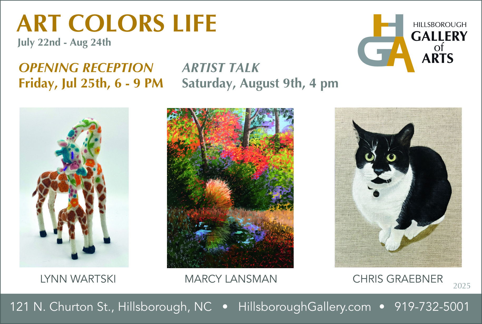 Botanical and travel paintings by Chris Graebner, vibrant acrylic landscape paintings by Marcy Lansman, needle felted figurative sculpture by Lynn Wartski. In the gallery July 22nd through August 24th. Opening reception during Hillsborough’s Last Friday Art Walk, July 25th, 6-9pm.