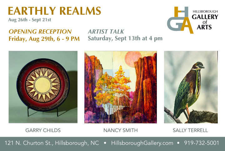 An opening reception for Earthly Realms will be held during Hillsborough’s Last Friday Artwalk, on August 29th from 6-9pm. Nationally recognized accordionist David Digiuseppe, will play music on the patio during the reception.
