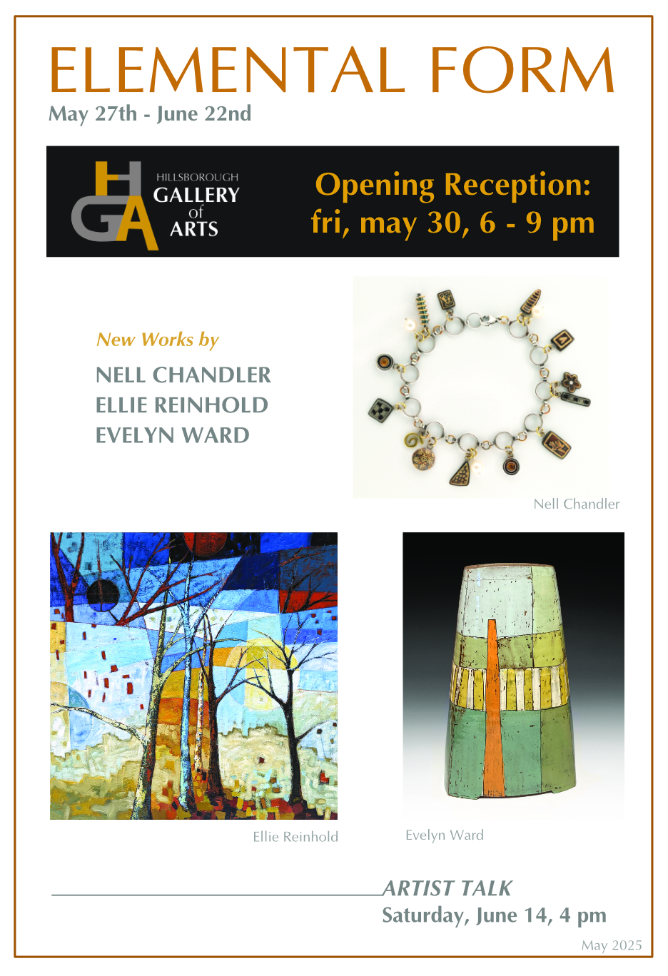 Elemental Form, May 27 – June 22, Opening reception May 30, 6-9:00 p.m. Carolina Campfire will perform music on the patio in front of the gallery during the art walk.
