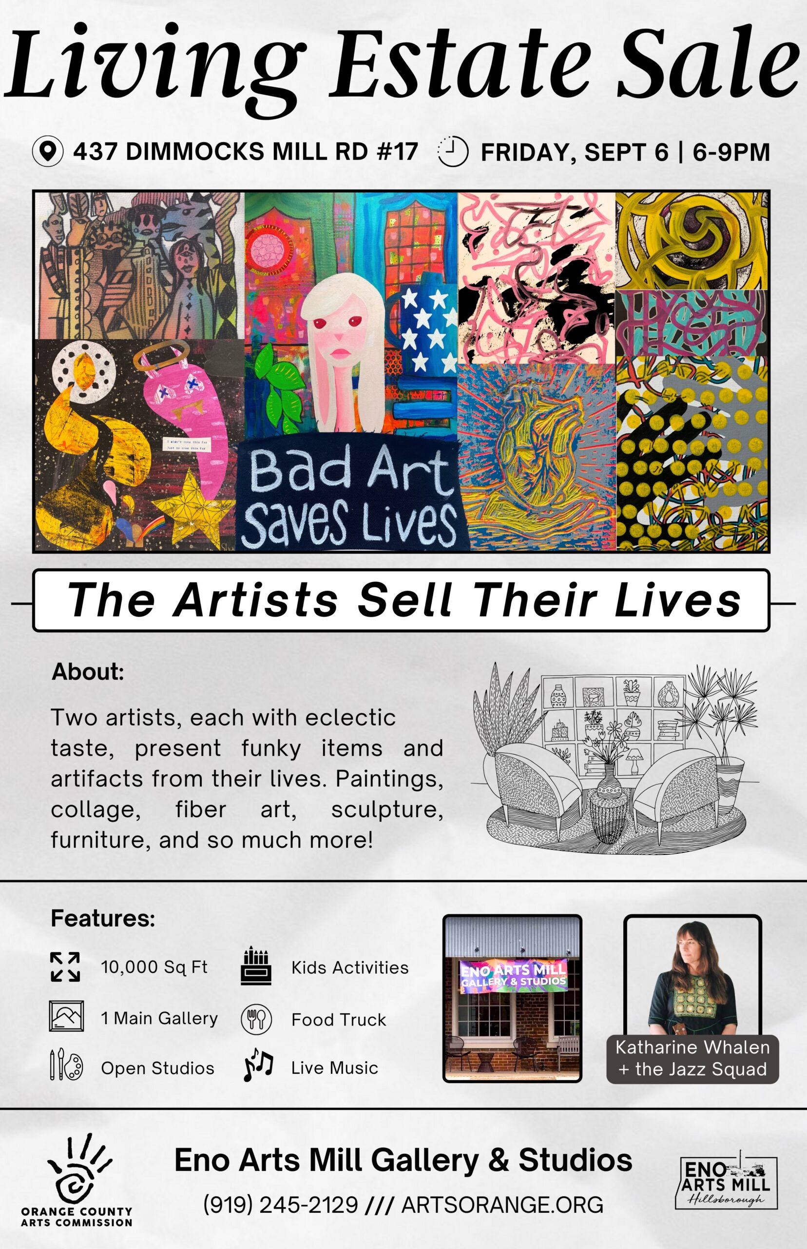 The “Living Estate Sale” will be held this September at Eno Arts Mill. Come out on Friday September 6 from 6-9pm for the Opening Reception. Be ready to BUY ART.