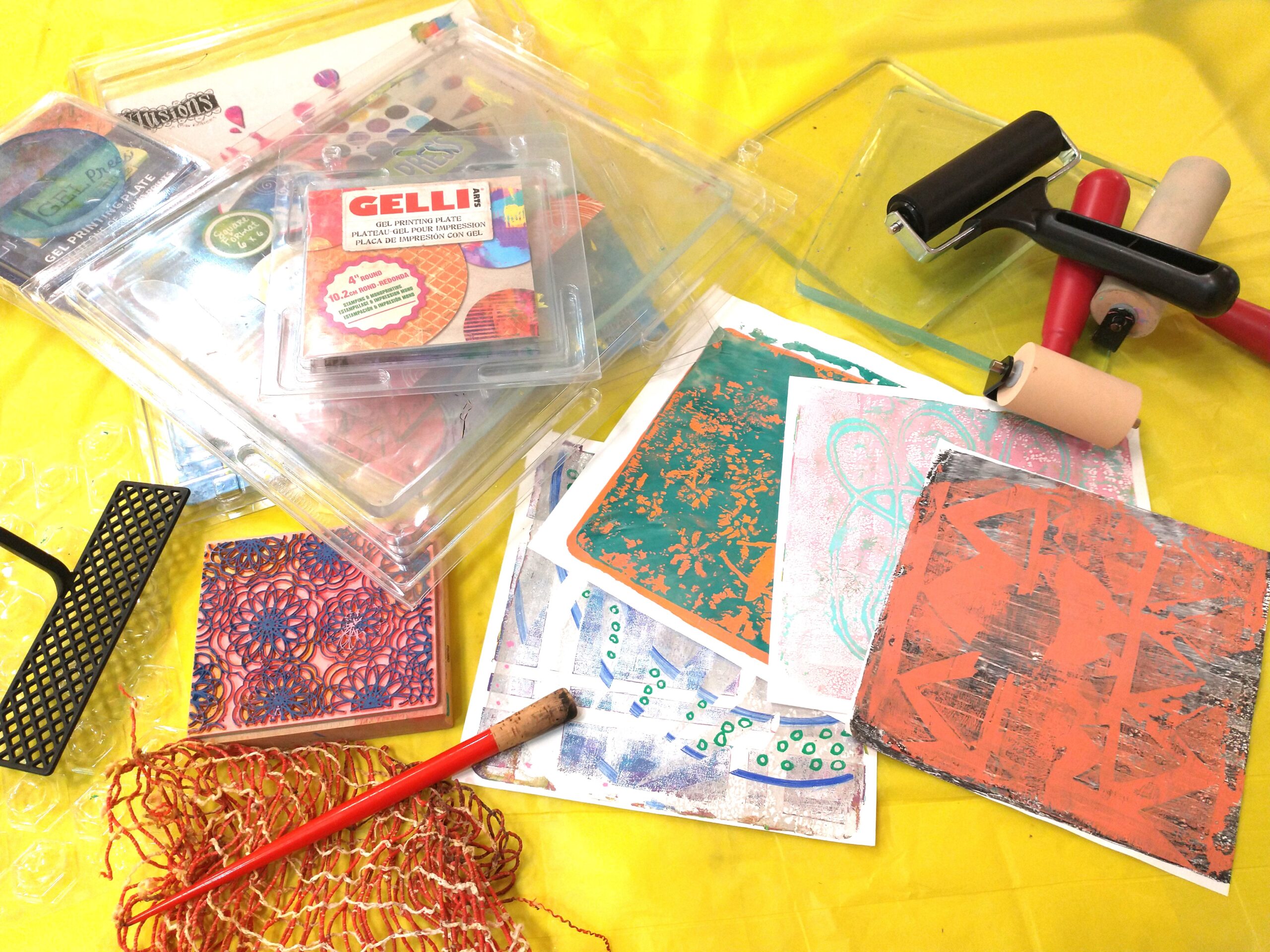 These are informal drop in sessions – you can come for some or all of the time — dedicated to gel printing. We have lots of gel print supplies – a variety of gel plates, brayers, papers, mark and texture makers, stencils, and paints.