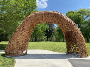 The Hillsborough Arts Council and the Orange County Arts Commission initiated the Riverpark Arch project when a Southern Red Oak on Calvin Street, approximately 250 years old, fell during Hurricane Florence in 2018. The arch uses strips of repurposed wood from the tree. Artist Jonathan Brilliant is an installation artist based out of Raleigh, North Carolina, and was chosen for this project from 32 applicants and 3 finalists. River Park Arch is around 15 feet high with the two bases being inspired by ati (huts) created by the Occaneechi tribe that lived along the Eno River.
