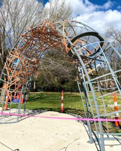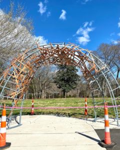 While River Park itself isn’t new, there is an exciting new project taking place at the entrance this season! The River Park Arch, designed by Raleigh-based installation artist Jonathan Brilliant, stands about fifteen feet high with two open dome-like structures at either endpoint. These base structures are inspired by the huts created by the Occoneechee that lived along the Eno River in the 17th Century. This project was initiated when an approximately 250 year-old, venerable Southern Red Oak on Calvin Street in West Hillsborough fell during Hurricane Florence in September 2018. The Hillsborough Arts Council and the Orange County Arts Commission invite the public to the River Park over the next several weeks to watch the progress unfold and to meet Brilliant, including during the Last Fridays Art Walk on March 25th.
